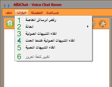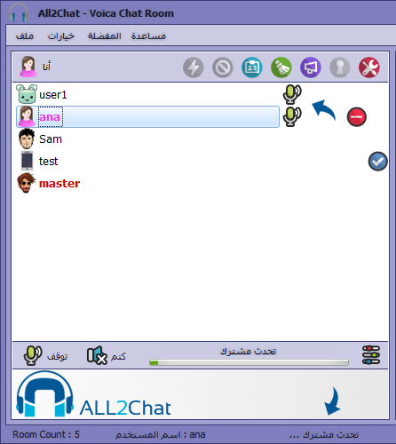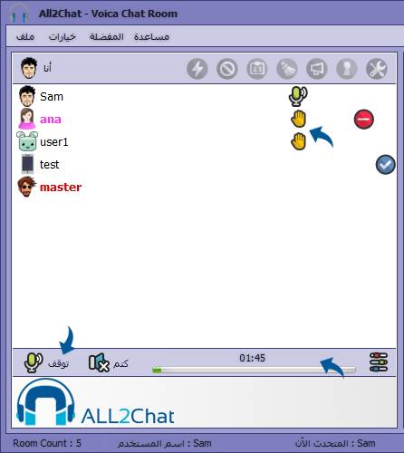 للتحدث في غرفة الدردشة اضغط على زر ( تحدث ) وللايقاف اضغط زر ( توقف )