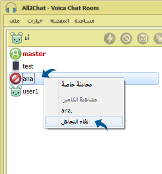 يمكن لأي مستخدم من تجاهل أي مستخدم آخر مهما كانت نوع اسمه وترتيبه