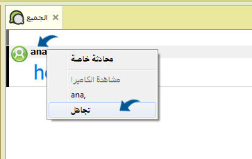 كما يمكن اعطاء تجاهل لاسم مستخدم عن طريق كلك على الاسم من الشات العام او البرايفت واختيار من القائمة خيار تجاهل