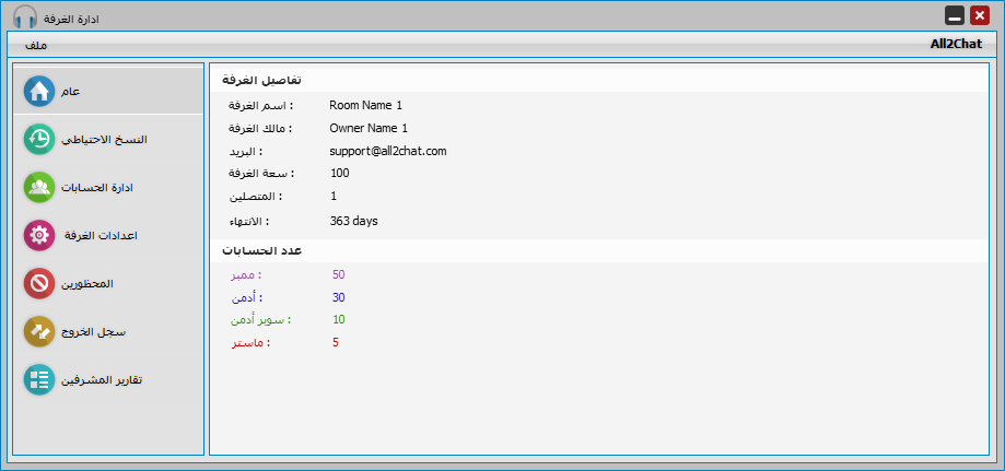 يحتوي قسم عام او الرئيسية على تفاصيل الاشتراك والمعلومات الاساسية مثل اسم الغرفة المسجل واسم مالك الغرفة وعنوان البريد الالكتروني بالاضافة لعدد الايام المتبقية لتجديد الاشتراك وسعة الغرفة المسموح بها وعدد المتصلين حاليا
