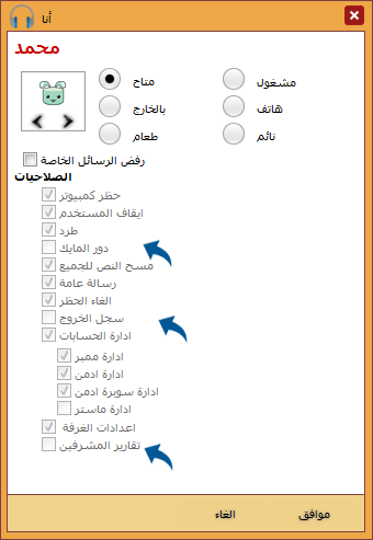 يمكن لمالك الغرفة التحكم بصلاحيات الأسماء المسجلة في غرفته بغض النظر عن صفة الاسم المسجل ان كان ممبر او ادمن او سوبر ادمن او ماستر احمر او زهري ويمكن لكل أسم مسجل من معرفة الصلاحيات المعطاة له من مالك الغرفة بالضغط على زر الصلاحيات الموجود في أعلى قائمة الأسماء ..
