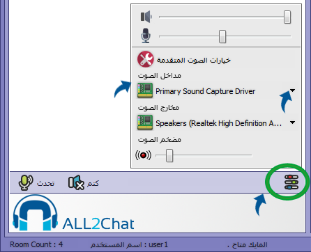 3- لاختيار نوع مدخل الصوت الموجود في الكمبيوتر ان كان ميكرفون للتحدث او ستيريومكس لتشغيل ملفات الصوت او اي مدخل صوت آخر,عند التبديل بين نوع الميكرفون او ستيريومكس لا حاجة للخروج والدخول مره اخرة , يتم تطبيق الاعدادات فورا